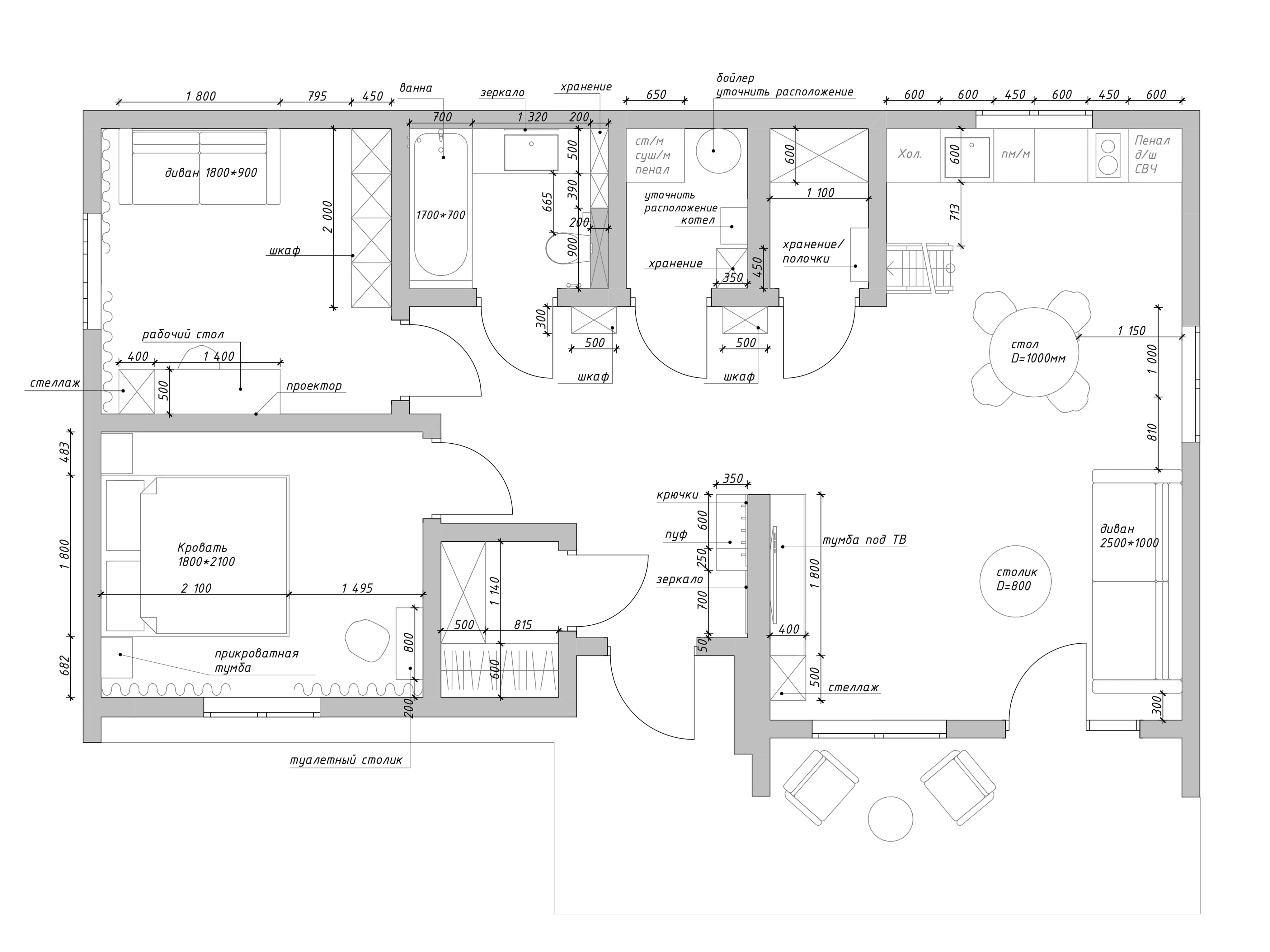 В ванной комнате мы выбрали черную сантехнику, чтобы создать контраст с остальными помещениями. Справа от входа спроектирована система хранения до потолка. Даже тумба в этом проекте напольная, ведь наша задача заключалась в том, чтобы сделать пространство максимально функциональным и оснастить его большим количеством полок и ящиков.