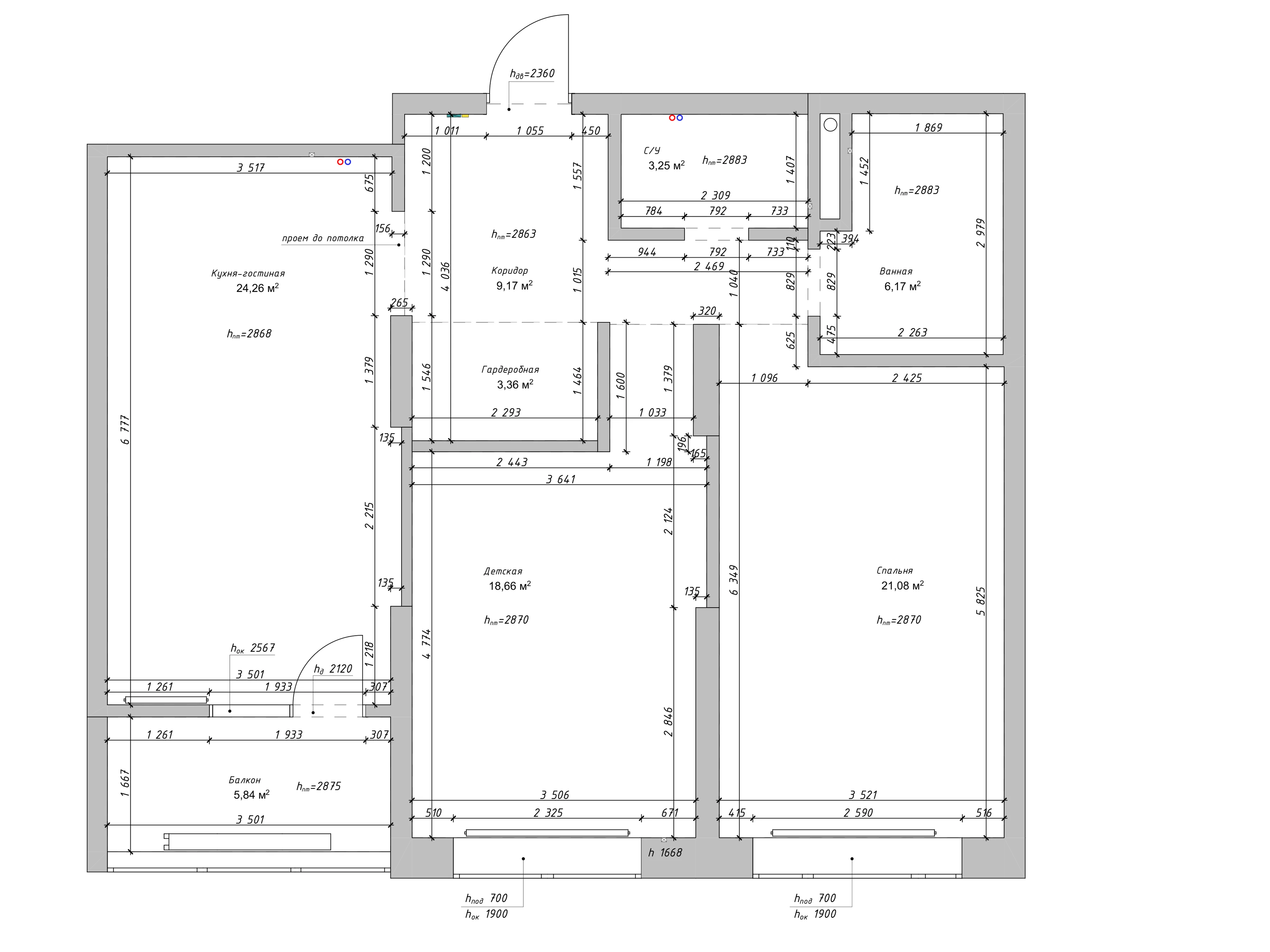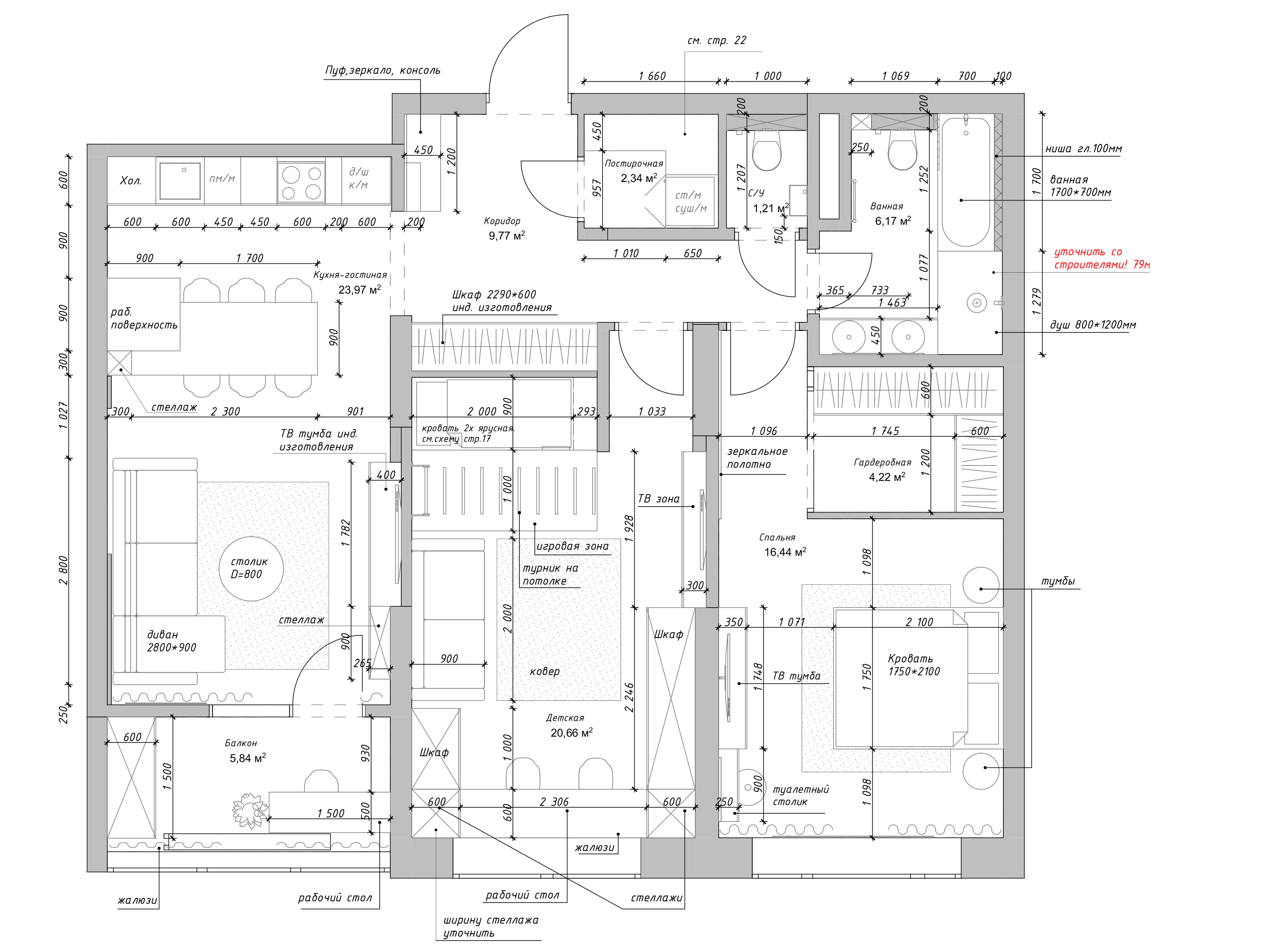 Первым делом, мы увеличили пространство детской комнаты, таким образом у нас получилось организовать двухъярусную кровать в нише. Далее - мы разделили зону гостевого санузла на постирочную и маленький с/у. Также, у заказчиков было огромное желание разместить ванную и душевую вместе, что тоже нам удалось.